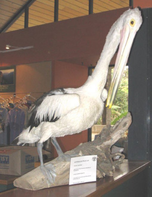 The pelican presumably thought the plastic bags were food. The pelican was preserved and named Pete. Since then he has been standing in front of a sign at Fitzroy Falls that informs visitors of how he died and the problems of plastic bags and ocean pollution.