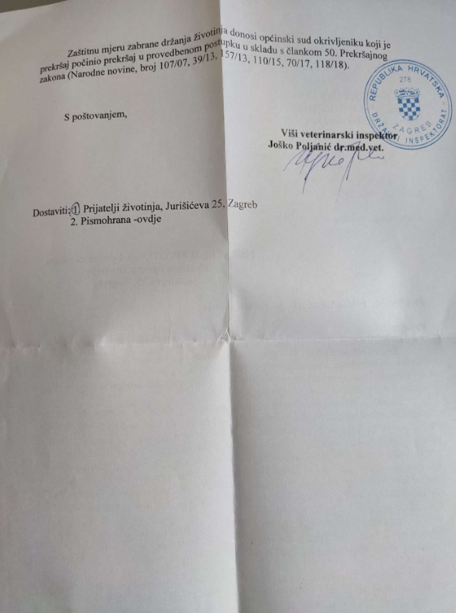 Osim toga, veterinarski inspektor ovlašten je „posjedniku privremeno oduzeti životinju koja se nalazi u stanju na temelju kojega se može zaključiti da životinja trpi bol, patnju ili veliki strah, da je ozlijeđena ili da bi nastavak njezina života u istim uvjetima bio povezan s neotklonjivom boli, patnjom ili velikim strahom te životinju koju posjednik drži u neprimjerenim uvjetima” i „podnositi prijavu sukladno odredbama kaznenog odnosno prekršajnog zakona” (članak 79. točke 3. i 6. Zakona o zaštiti životinja). Članak 81. stavak 2. Zakona propisuje da privremeno oduzeta životinja „može biti vraćena posjedniku ako su ispunjeni uvjeti za njezino daljnje držanje određeni odredbama ovoga Zakona, a u protivnom može biti zbrinuta u skloništu ili smještena u primjereni smještaj ili po trajnom oduzimanju udomljena ili prodana”. Veterinarska inspekcija koja je bila upoznata sa slučajem nije iskoristila tu zakonsku mogućnost kako bi pomogla kravi koja je trpjela bol.