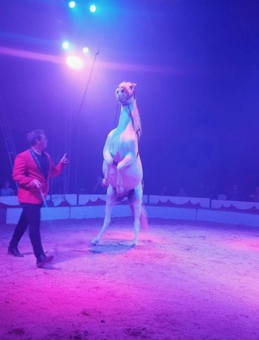 Prosljeđujemo materijale koje su nam poslali građani s nastupa cirkusa Candy u Zaprešiću, gdje je tijekom protekloga vikenda održana zadnja predstava u tom gradu nakon više tjedana korištenja životinja u predstavama. Kao što je vidljivo, tijekom nastupa koristi se bič, a konj se na zamah biča propinje na stražnje noge i izvodi druge trikove koji su isključivo rezultat dresure i biča, a ne prikazivanja „vrsti svojstvenog ponašanja koje je istovjetno ponašanju životinja u prirodnom okolišu”, što je jedina dopuštena iznimka za držanje i korištenje u cirkuskim predstavama, i to samo domaćih životinja, prema odredbama Zakona o zaštiti životinja (NN 102/2017, 32/2019). U prirodi, propinjanje konja je snažan komunikacijski signal koji označava intenzivnu upozoravajuću situaciju nakon koje može slijediti napad, a uz ritanje je nagonska reakcija za obranu teritorija. Tjeranje konja na takvu reakciju u okviru cirkuske predstave, uvjetovanu mahanjem biča, izaziva u životinji stres i strah. Na videosnimkama može se vidjeti da se deve spuštaju na prednje noge, a poniji dižu prednje noge na leđa ponija koji stoji ispred, i sve to uz zapovijedi dane mahanjem ili podizanjem biča. Ništa od navedenoga nije vrsti svojstveno ponašanje kakvo izražavaju u svojem prirodnom okolišu.