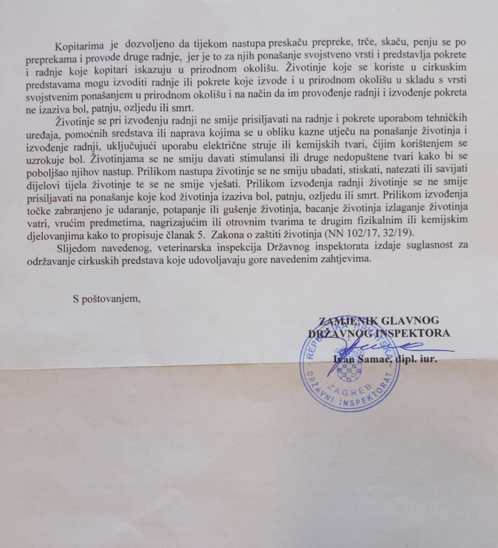 Na temelju svega navedenoga, ukazujemo na nužnost da veterinarska inspekcija zabrani cirkusu Candy daljnje nastupe sa životinjama. Molimo vas da nam javite urudžbeni broj ove naše prijave.