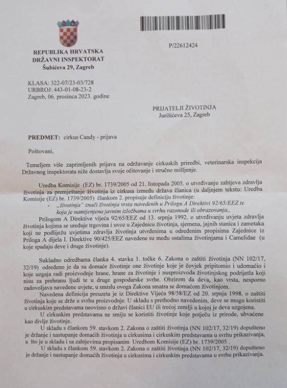 Cirkus smo vam prijavili 24. travnja i 22.svibnja 2023., a 21. kolovoza 2023. poslali smo i požurnicu, no vi ignorirate naše prijave i traženje da nas izvijestite jeste li postupali po njima i koji su nalazi inspekcijskog nadzora. U međuvremenu, građani nam pišu iz svakog novog grada gdje nastupa cirkus Candy, koji drži životinje i koristi ih za nastupe, te su zgroženi zato što veterinarska inspekcija dopušta cirkusu da već pola godine nastupa po Hrvatskoj i profitira na protuzakonitom korištenju životinja.